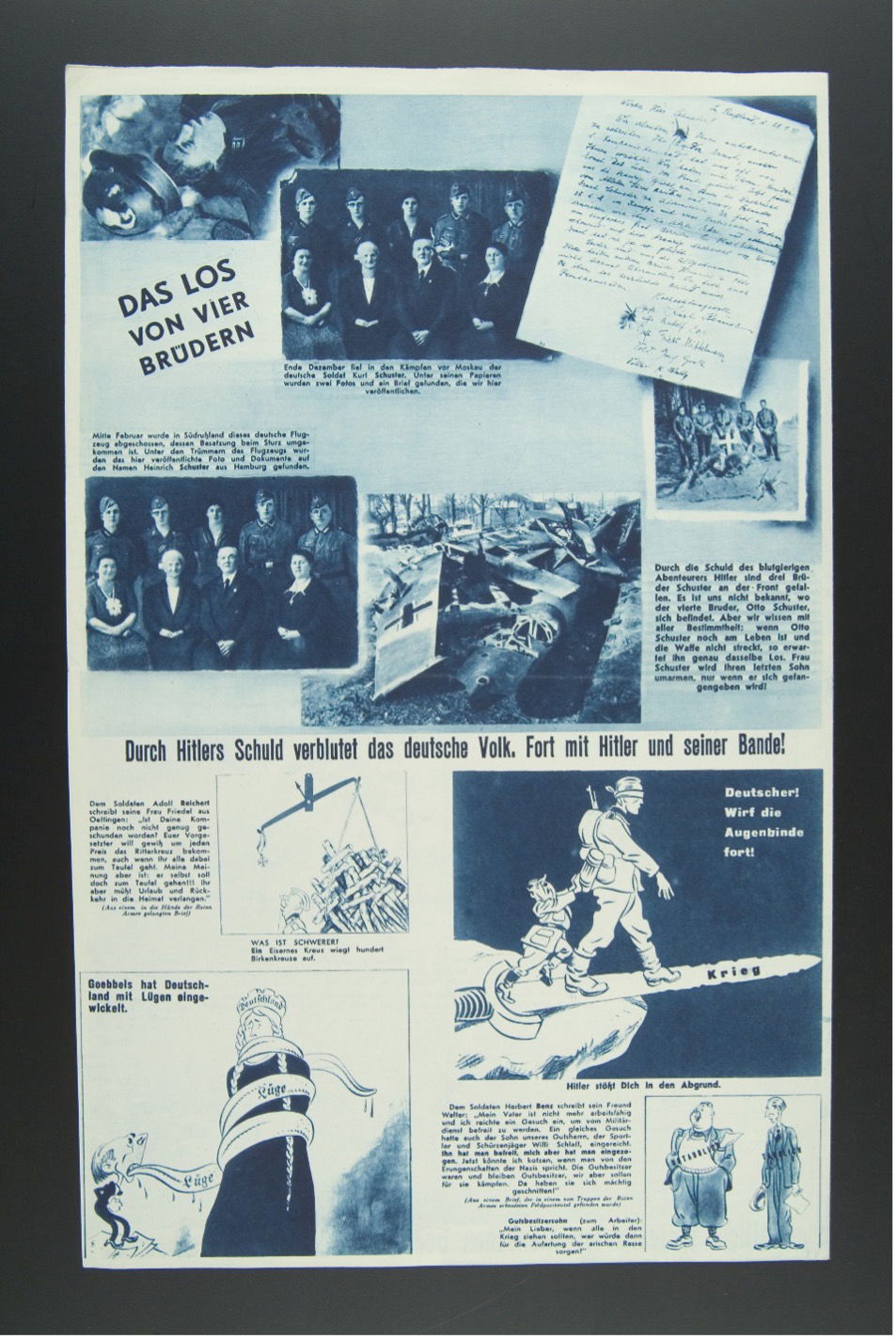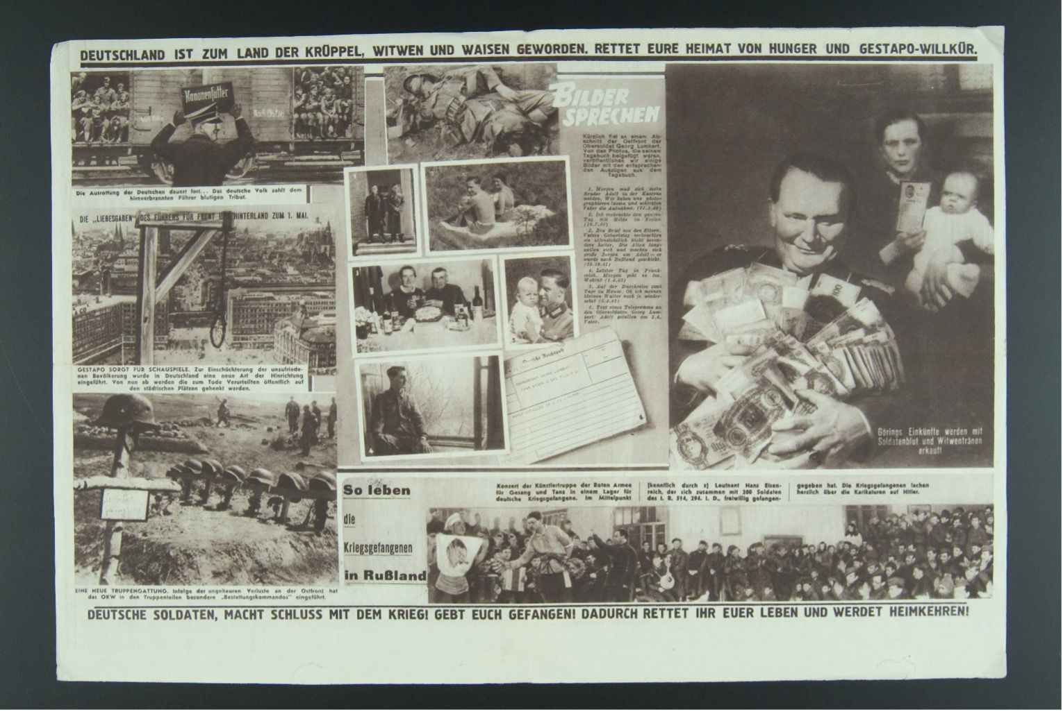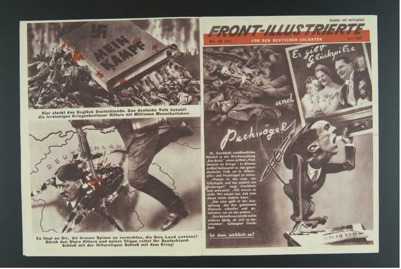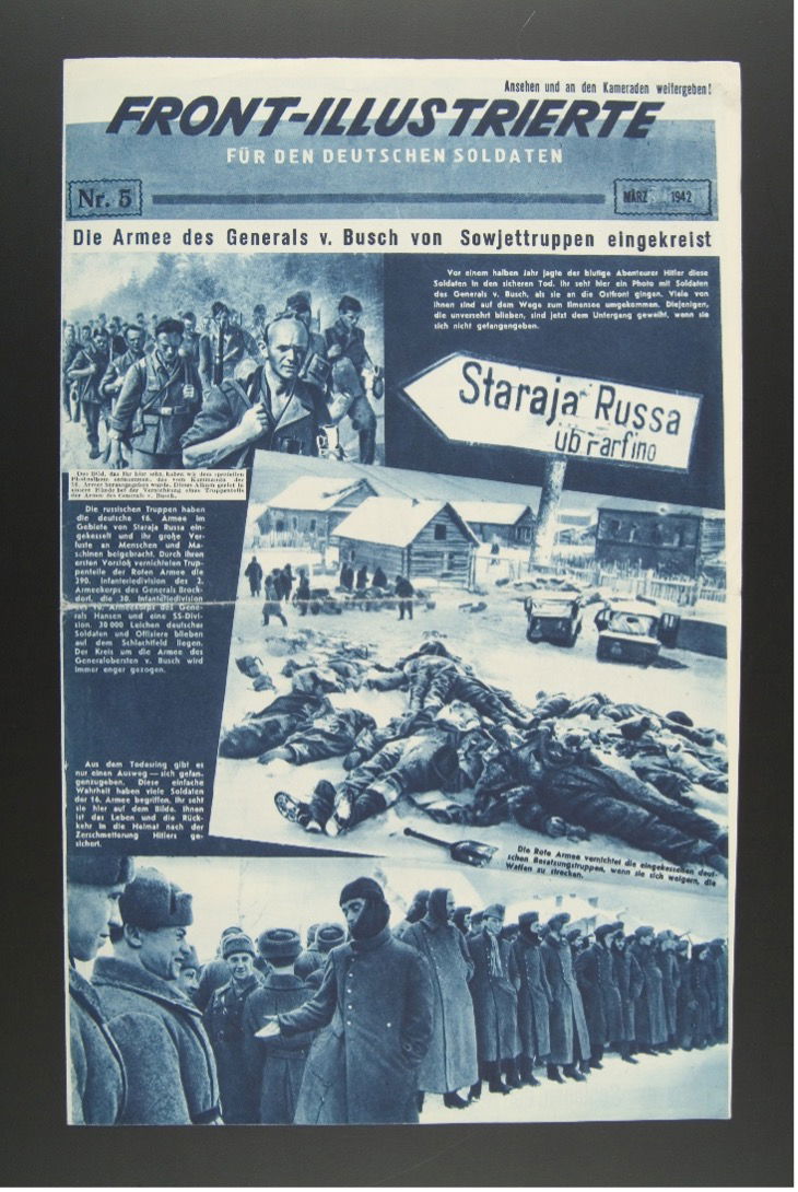 This blog examines a revealing wartime experiment in counter-propaganda: the Soviet periodical Front-Illustrierte (The Illustrated Front), produced for German soldiers during the Second World War. Rather than simply denouncing Nazism, it pursued a second-order strategy aimed at undermining trust in German state-sponsored mass communication, above all the propaganda apparatus led by Joseph Goebbels. It turned propaganda against itself, using images to portray Nazi communication as a system of organised deceit. This strategy relied on the distinctive force of visual media: more affectively immediate than language and, in the case of photography, invested with documentary authority, images could intervene directly in regimes of credibility. Yet they did not operate in isolation. Meaning emerged from the coordination of picture and text, as captions, typography, and layout guided interpretation and amplified the visual field’s affective charge.