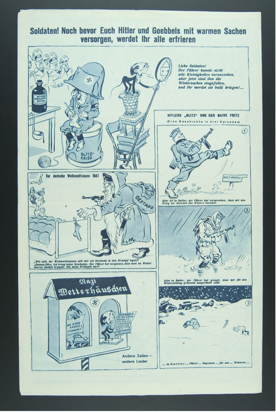 The analysis that follows identifies specific representational strategies adopted by the Soviet producers of Front-Illustrierte in articulating narratives of German deceit. It ascertains the specificity of these audience-targeting strategies in two ways: first, by situating them within the longer history of modern information warfare and illustrated mass media; and second, by comparing Front-Illustrierte’s approach with that of Soviet wartime publications aimed at domestic audiences, in which German informational deceit was likewise criticised. Drawing in particular on cartoons by Evgenii Kogan, a graphic designer and Red Army officer associated with the newspaper Razobyom vraga (We Will Crush the Enemy), this comparison makes it possible to trace how visual accusations of disinformation were adapted across audiences, languages, and ideological settings during total war. In doing so, the blog shows how the struggle over truth was fought not only through verbal narratives, but through visual images of propaganda itself.